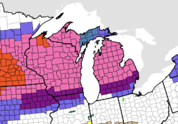 Here is a view of the ice storm as of 2:35pm CST. The salmon colors indicate freezing rain with the darker shades indicating heavier rates of rain. Ice is accumulating throughout the region. In Michigan, where the photo below (via Twitter) was taken, the freezing rain will worsen tonight.
